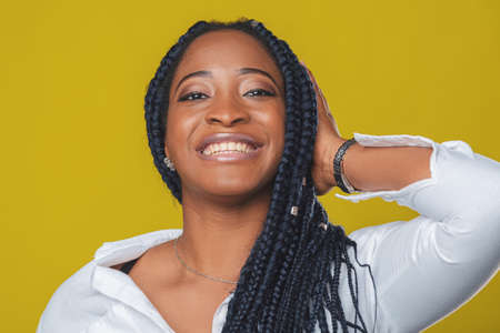 beautiful african american girl in a white shirt rejoices and smiles on a yellow background