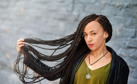 Beautifully twisted braids. Portrait of an attractive young woman with beautiful braids posing outdoors.
