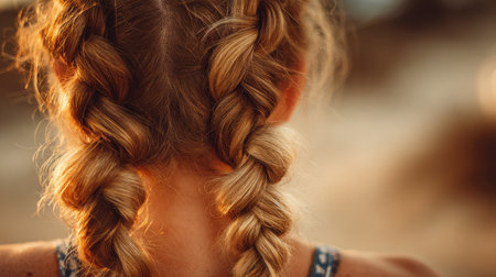 This image captures a girl with beautiful braided blonde hair, backlit by a warm sunset on the beach. It embodies youthful joy and natural beauty.