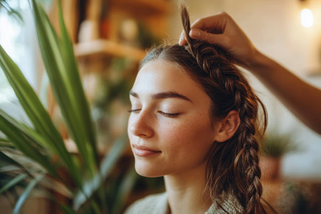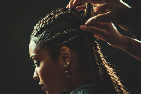 Close-up of hands braiding a girl hair, showcasing intricate styling, tradition, beauty care, and elegant hair artistry.