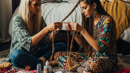 Cinematic Wide Shot (16:9) capturing two diverse female friends collaborating on intricate festival