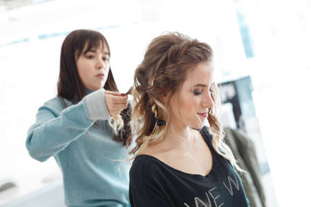 Hairdresser coiffeur makes hairstyle for young woman
