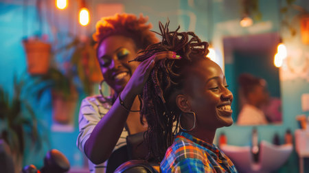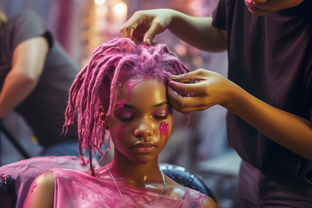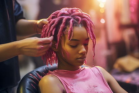 Young African American woman gets her hair dyed pink in a salon. Generative AI. high quality illustration