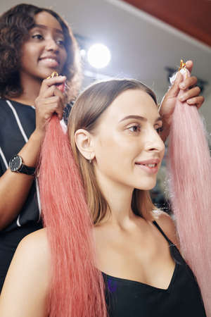 Smiling gorgeous young woman looking at mirror when hairstylist showing her pink hair extensions