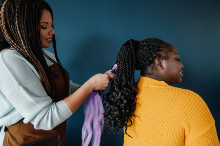 Close-up of African hairdresser braiding hair to female customer on blue background