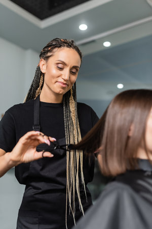 hairdo, positivity, hairdresser with braids cutting short brunette hair of woman, beauty worker, haircut, professional, beauty salon work, haircut, hairdressing cape, salon beauty tools, blurred