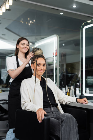 Confident African hairdresser braiding hair to smiling female customer on blue background