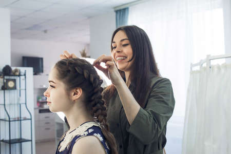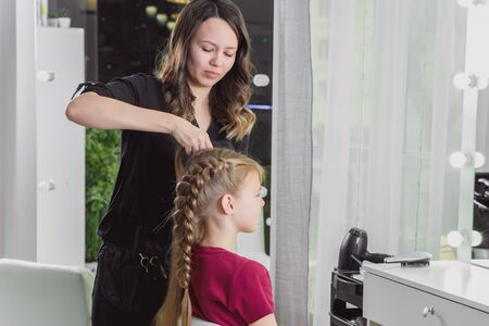 Hairdresser weaves a braid to a preteen blond girl in a beauty and hair salon