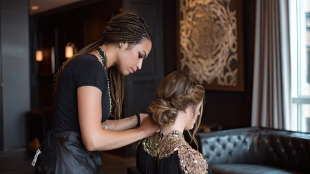 A skilled hairstylist carefully creates an elegant updo hairstyle for a client in a modern salon, showcasing beauty and professionalism in an upscale atmosphere.