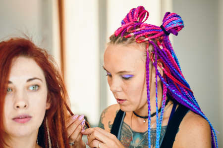 Girl hairdresser weaves woman ginger dreadlocks and cut threads with scissors. Braiding process plait with colored kanekalon. Bright pigtails on head. Hippie style hairstyle. Beauty salon services.