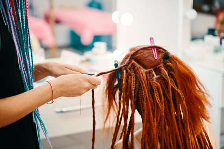 Barber braids dreadlocks. The hairdresser weaves braids with red kanekalon beautiful red-head girl. Beautiful cool hairstyles. Hair service in a beauty salon. Fashionable womens style.