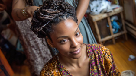 African American woman getting her hair done. Hairdresser's work with specific hair