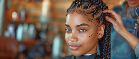 A hair stylist braids Zizi cornrows to a young and beautiful girl