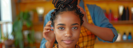 Close-up of a self-assured hair stylist braiding the hair of a young African lady in a salon
