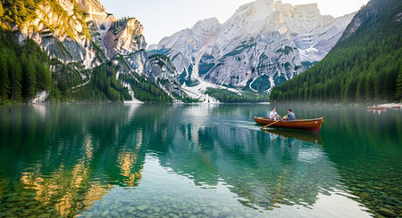 A couple enjoys a peaceful row in a wooden boat across the incredibly clear, turquoise waters of an alpine lake. Towering, mountains with snow-capped peaks and dense pine forests surround the serene lake. The water is so transparent that the colorful pebbles on the lakebed are clearly visible. The surrounding mountains and trees are beautifully reflected on the glassy surface of the water under a bright blue sky.