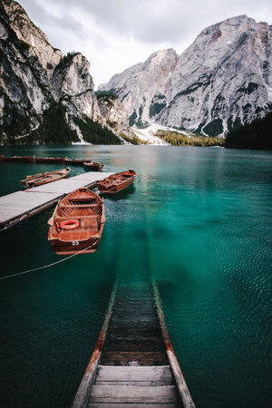 romantic place with brown wooden boats stand on the azure water on the alpine lake Lago di Braies. Dolomites, South Tyrol, Italy, Europe. italian alps.