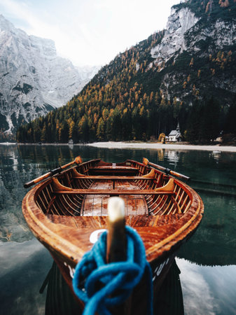 Wooden boat on lake braies in south tyrol, italy