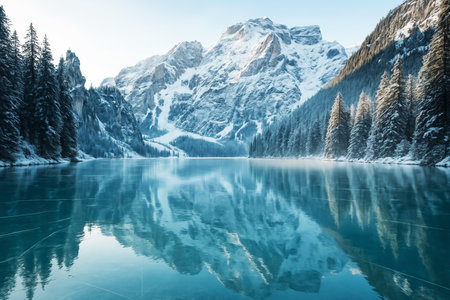 Natural landscapes of the lake Braies (Lago di Braies) with morning fog and reflection of the mountain peak in Dolomites, Italy