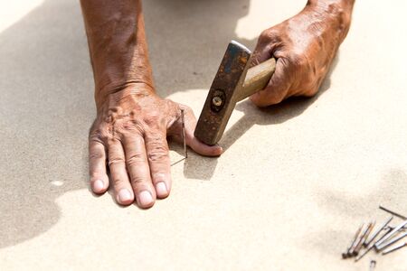The man hit his finger with a hammer. Professional carpentry, woodwork and people. concept of injury in the workplace