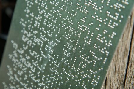 Close up some braille text on page paper written by blind. Blind man using slate and stylus tools making embossed printing the braille alphabet Code on sheet.