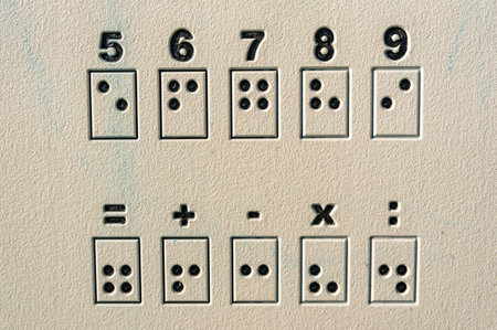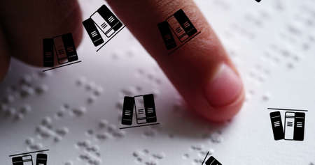 Hand of a blind person reading some braille text on page paper to learn. Finger of blind student touching the braille alphabet Code on sheet.