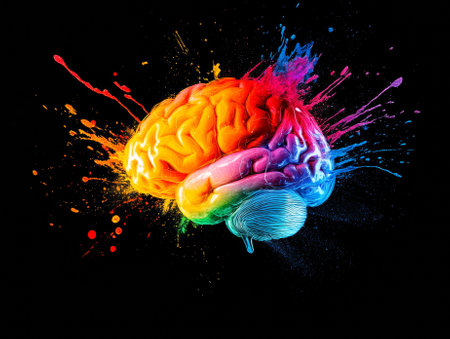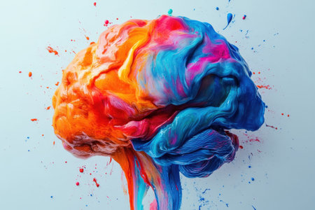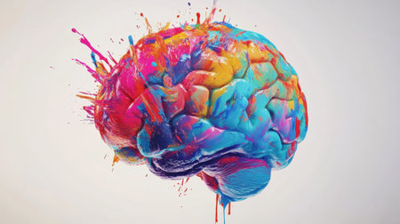 A colorful brain adorns a light background, showing vivid splashes of paint in an artistic expression of creativity and thought.