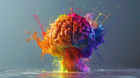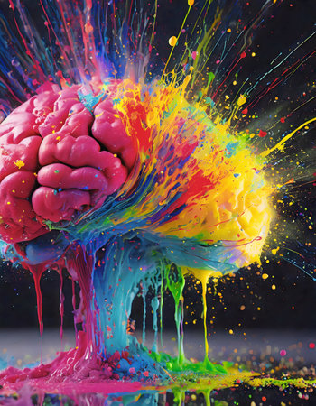 A colorful brain with a splash of paint on it, AI