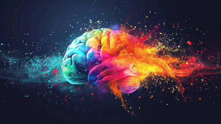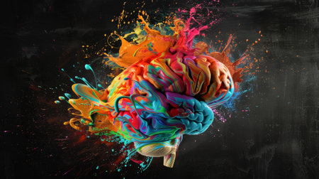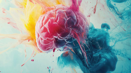 A colorful brain with paint splatters all over it. The brain is surrounded by a splash of colors, making it look like a work of art. Scene is vibrant and creative
