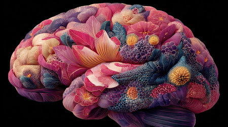 This stunning artwork features a brain intricately designed with colorful flowers and abstract patterns, symbolizing creativity and imagination in a vibrant display.