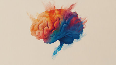 A vibrant background with a brain made of overlapping, swirling colors and abstract shapes, set against a smooth, gradient backdrop.
