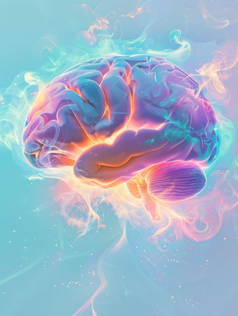 A vibrant, stylized brain rendered in pastel colors, surrounded by ethereal smoke wisps, creating a surreal and imaginative atmosphere.