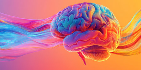An artistic rendering of a human brain with colorful, flowing neural pathways, illustrating complex cognitive processes and mental activity.