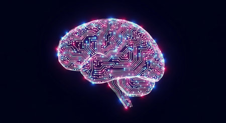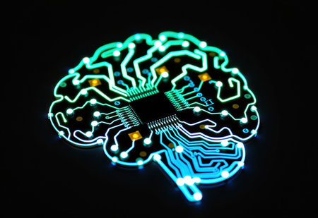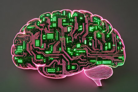 An illustration depicts a human brain constructed from circuit boards and illuminated lights. The image features a side view against a black background. The style is digital, emphasizing technology and conceptual ideas, potentially suitable for editorial content or commercial projects related to innovation.