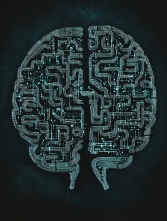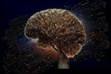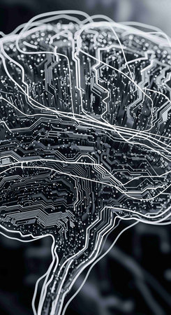 This striking image showcases a futuristic brain embedded with glowing circuits on a digital background, symbolizing the relationship between artificial intelligence and neural networking.