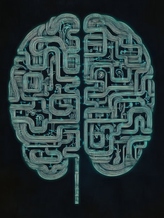 A brain designed as a labyrinth features intricate pathways resembling circuitry against a dark backdrop, allowing for added text.