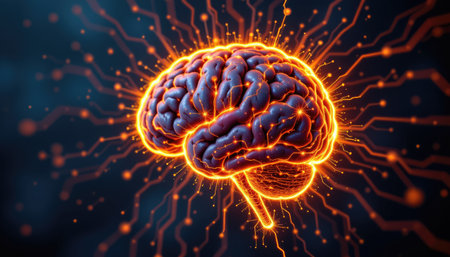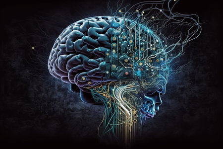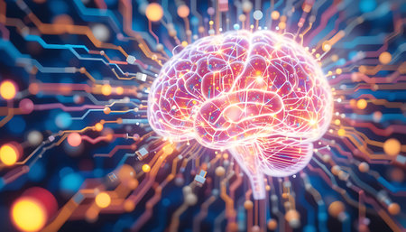A vibrant, luminous brain embedded with intricate circuitry, highlighting the fusion of human cognition and cutting-edge digital technology in a futuristic style.