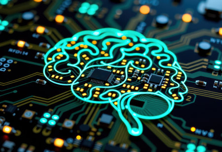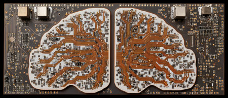 A stunning visualization of a digital brain on a circuit board, symbolizing advancements in artificial intelligence and modern technology merging with electronic designs.