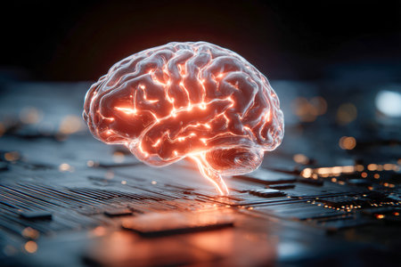 3d rendering of a brain sitting on a circuit board with red glowing lights, symbolizing the power of ai