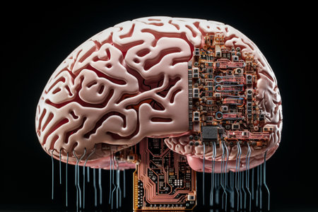 A stunning visual representation of a brain integrated with a circuit board, symbolizing the fusion of artificial intelligence and human cognition in a digital world.