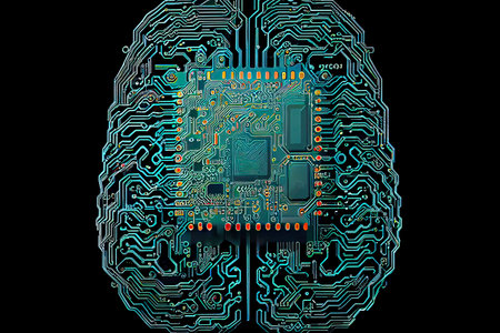 A stylized brain circuit overlaid on a circuit board, visually representing the concept of artificial intelligence or brain-computer interface.