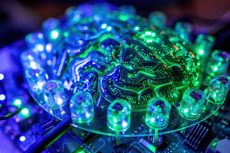 A mesmerizing representation of a brain intertwined with vibrant LED circuits, symbolizing the fusion of technology and intelligence in a modern digital age.