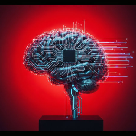 Red accents in a futuristic AI brain on a black circuit board
