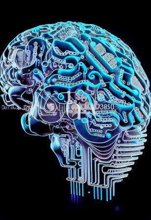 The image shows a stylized 3D model of a brain as an intricate circuit board, symbolizing artificial intelligence.