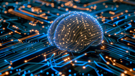 A digital brain on circuit board symbolizes artificial intelligence and technology
