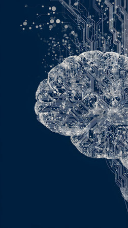 This striking image showcases a futuristic brain embedded with glowing circuits on a digital background, symbolizing the relationship between artificial intelligence and neural networking.