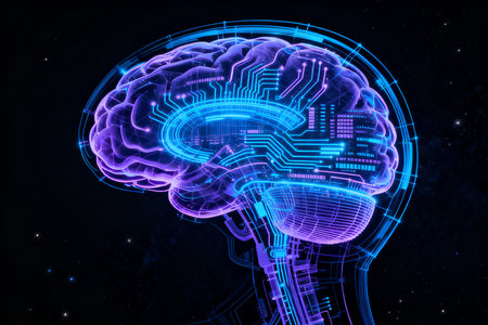 A vibrant, luminous brain embedded with intricate circuitry, highlighting the fusion of human cognition and cutting-edge digital technology in a futuristic style.