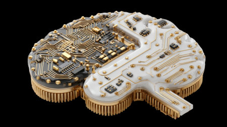This captivating image showcases a brain composed of intricate circuit board elements, symbolizing the fusion of technology and neuroscience.
