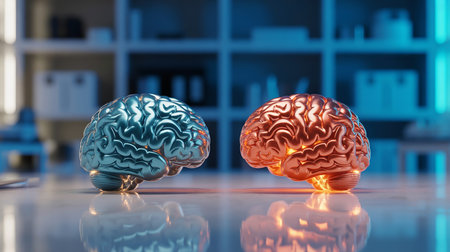 Two metallic brain models, one silver and one glowing orange, are placed on a reflective surface.