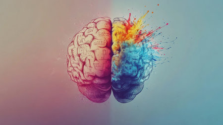 A vivid representation showcases the left side of the brain filled with logical patterns, while the right side bursts with creative colors and forms.