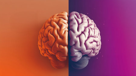 A digitally rendered human brain, bisected, is shown against a two-toned background. One hemisphere is warm orange, the other cool purple. Detailed brain texture is visible.